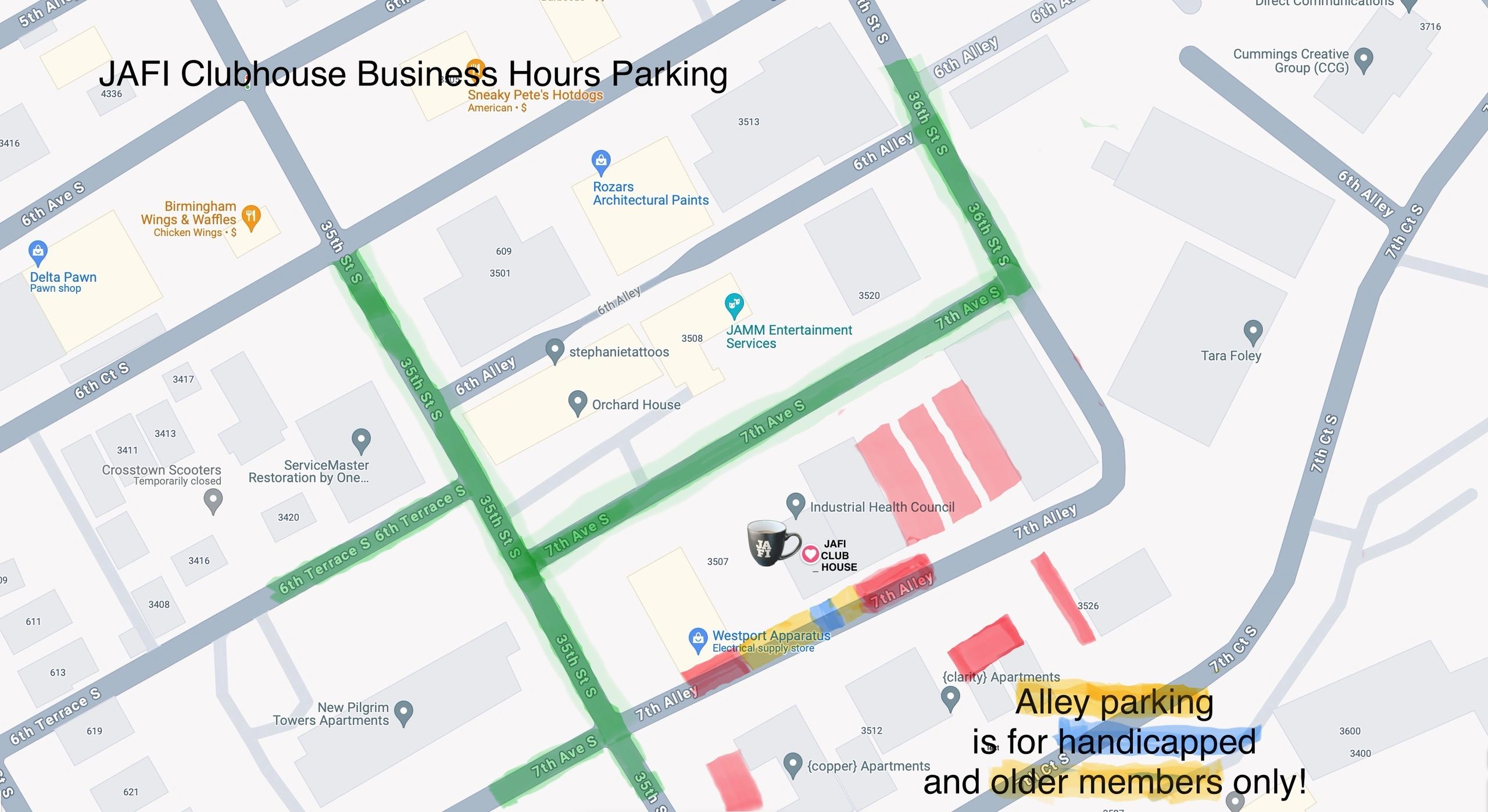 JAFI Clubhouse does not generate the income needed from dollar cups of coffee to compete with commercial businesses for space. Several potential sites closer to our present location were rejected because street parking was nonexistent, or required paying parking meters. The site we found does have enough parking directly next to the building to welcome those who don't have the ability walk a half block, or go up stairs. The street parking is free, and expected to remain so.